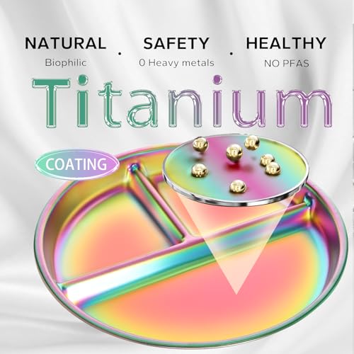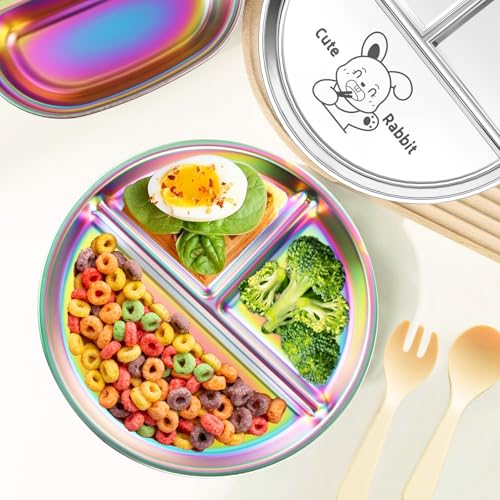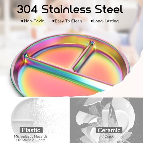 Fun Rainbow Finish: With a vibrant rainbow finish, these divided plates are loved by toddlers, kids, and even adults! The engaging colors of stainless steel plates with lids make introducing new foods easier and encourage self-feeding, turning mealtime into a fun experience your child will look forward to