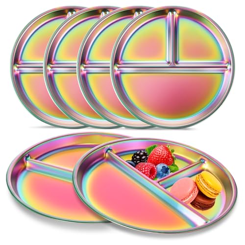 9″ Stainless Steel Toddler Plates Set of 6, Divided Plate for Kids & Baby, Non Toxic Unbreakable Dishes Dinnerware Adults Portion Control Snack Container, Colorful Meal Time Chums