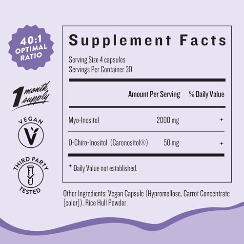 𝟑𝟎 𝐃𝐀𝐘 𝐒𝐔𝐏𝐏𝐋𝐘: Recommended 4 capsules per day – Ingredients: Myo Inositol 2000mg D Chiro Inositol 50mg – All our third-party tested Myo Inositol supplements are Made in the USA in a cGMP certified facility – Natural Ingredients – Vegan, Halal, Gluten-free, Dairy-free, and Sugar-free.